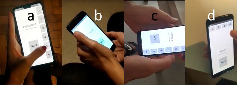 This figure shows 4 different observed patterns (a, b, c and d) while holding mobile devices when selecting targets on action bar.